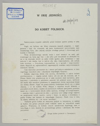 W imię jedności : Do kobiet polskich / Grupa kobiet polskich w Szwajcaryi. - [Szwajcaria] : [wydawca nieznany], [1914-1917]. - [1] karta (1 strona) ; 28x22 cm.
