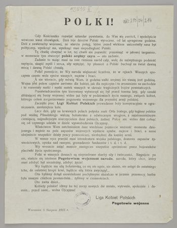 Polki! / Liga Kobiet Polskich Pogotowie wojenne. - [Warszawa] : [wydawca nieznany], 1915 VIII 5. - [1] karta (1 strona) ; 29x23 cm.
