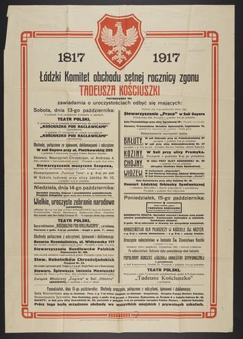 Zawiadomienie zawiera program obchodów w dniach 13 - 15 X 1917 w Łodzi.