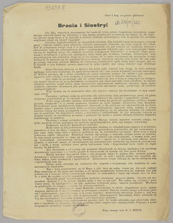 Bracia i Siostry! / Wasz starszy brat K. J. Miecz. - [Miejsce nieznane] : [wydawca nieznany], [1916]. - [1] karta (1 strona) ; 32x25 cm.
