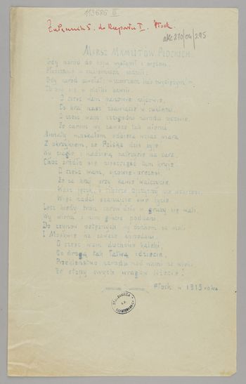 Marsz mamutów płockich : Płock w 1915 roku. - [Płock : wydawca nieznany], 1915. - [1] karta (1 strona) ; 32x20 cm.