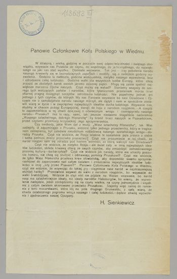 Panowie Członkowie Koła Polskiego w Wiedniu / H. Sienkiewicz. - [Miejsce nieznane] : [wydawca nieznany], [1914]. - [1] karta (2 strony) ; 30x18 cm.
