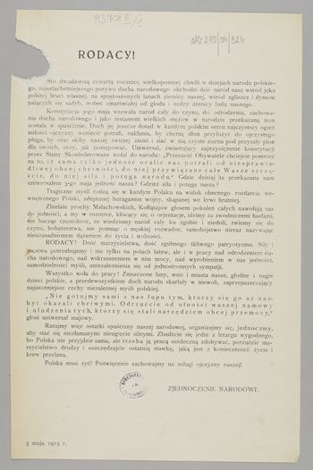 Odezwa patriotyczna, wezwanie do walki i pracy dla ojczyzny, z okazji rocznicy Konstytucji 3 Maja.