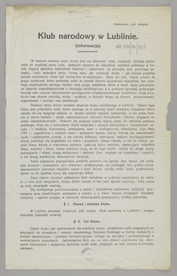 Dotyczy powołania Klubu Narodowego w Lublinie (statut zatwierdzono 28 IV 1917 r.), informacja obejmuje genezę, cele, obowiązki członków Klubu.