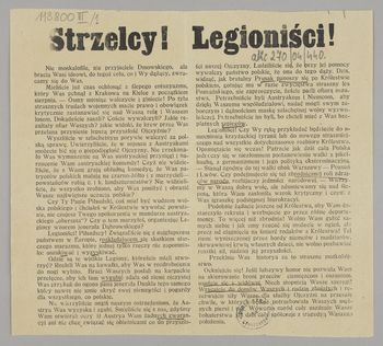 Strzelcy! Legioniści! - [Miejsce nieznane] : [wydawca nieznany], [1915]. - [1] karta ; 19x21 cm.