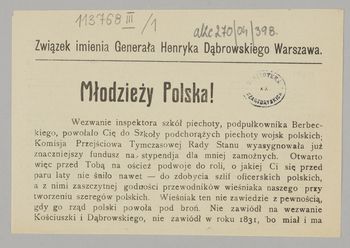Odezwa agitująca w sprawie wezwania inspektora szkół piechoty ppłk. L. Berbeckiego do wstępowania do szkół podchorążych piechoty wojsk polskich.