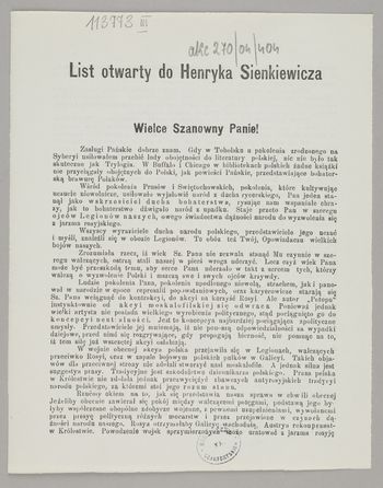 List otwarty do Henryka Sienkiewicza / Władysław Studnicki. - [Miejsce nieznane : wydawca nieznany], 1915. - [1] karta ; 22x18 cm.