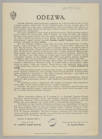 Odezwa / Prezes N.K.N.: Dr Władysław Leopold Jaworski. - Kraków : nakładem Departamentu Organ. N.K.N., 1915 (Kraków : Druk. Ludowa). - [1] karta ; 32x23 cm.