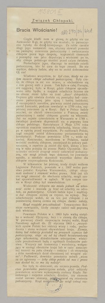 Związek Chłopski / Zarząd Główny Związku Chłopskiego. - [Miejsce nieznane] : [wydawca nieznany], 1915. - [1] karta ; 36x11 cm.