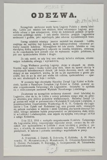 Odezwa / Komitet: A. Brzeziński [i 13 innych]. - Lublin : Druk "Estetyczna" I. Śliwickiej, 1916. - [1] karta (1 strona) ; 27x18 cm.