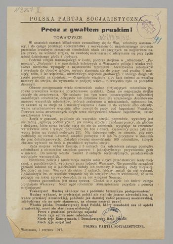 Odezwa w związku ze strajkiem w gazowni warszawskiej, zawierająca protest przeciwko represjom niemnieckich władz okupacyjnych.