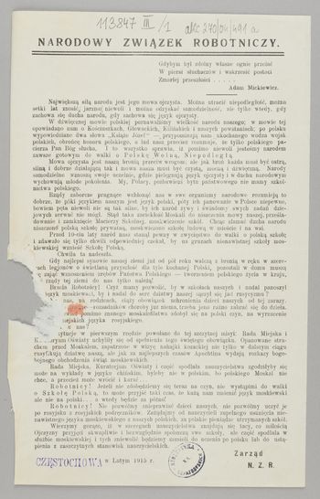 Narodowy Związek Robotniczy / Zarząd N.Z.R. - [Częstochowa] : [wydawca nieznany], 1915. - [1] karta ; 27x17 cm.