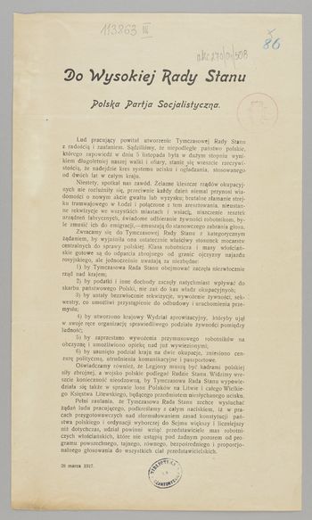 Do Wysokiej Rady Stanu Polska Partja Socjalistyczna. - [Miejsce nieznane] : [wydawca nieznany], 1917. - [1] karta ; 32x19 cm.