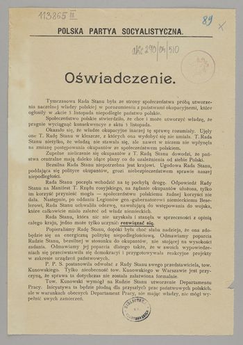 Oświadczenie krytykujące działalność Rady Stanu i odwołanie z jej członków przedstawiciela PPS Włodzimierza Kunowskiego.