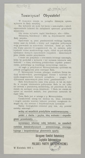 Odezwa w związku z rozwiązaniem Rady miejskiej w Sosnowcu i apel o utworzenie samorządu.