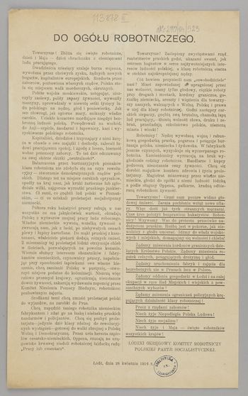 Odezwa wymierzona przeciwko okupantowi niemieckiemu i wyzyskowi robotników, wydana z okazji zbliżającego się święta 1 Maja.