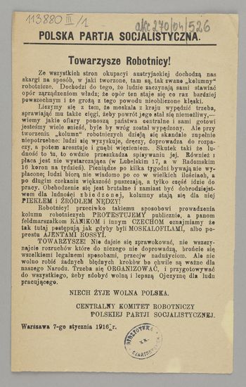 Streszczenie: Protest przeciwko sposobowi tworzenia kolumn robotniczych do prac przymusowych przez okupanta austriackiego.
