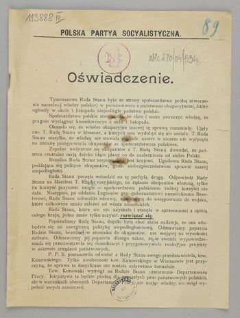 Oświadczenie krytykujące działalność Rady Stanu i odwołanie z jej członków przedstawiciela PPS Włodzimierza Kunowskiego.