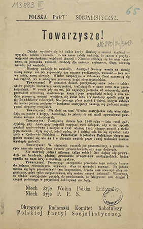 Streszczenie: Odezwa potępiająca przymusowe wcielanie do kolumn robotniczych przez okupanta austriackiego.