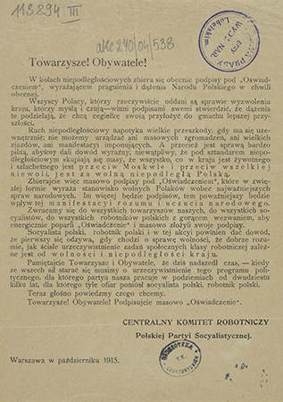 Incipit: W kołach niepodległościowych zbiera się obecnie podpisy pod "Oświadczeniem"...