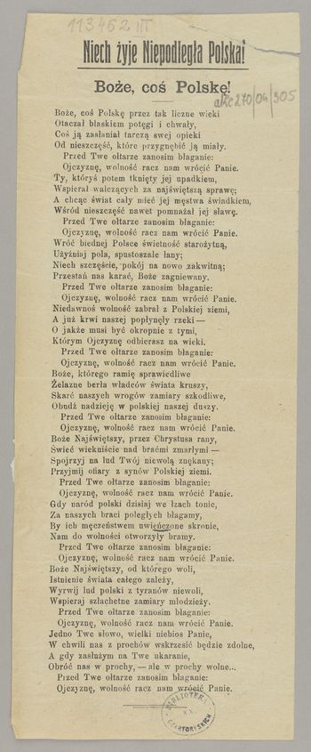 Boże, coś Polskę / [Alojzy Feliński]. - [Miejsce nieznane : wydawca nieznany, 1915]. - [1] karta (2 strony) ; 16x10 cm.
