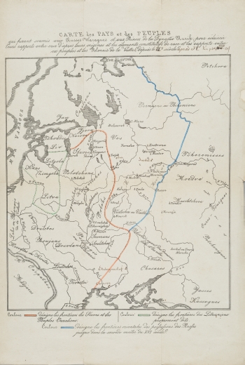 Na mapie zaznaczone: granice etniczne, sieć hydrograficzna, nieliczne miejscowośc; linia brzegowa - szrafy.