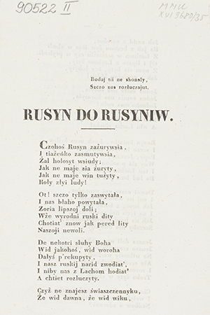 Rusyn do Rusyniw / D. Koczyndyk, Rusyn z Drohobyczi. - [Lwów : wydawca nieznany, 1848] (Druk. Inst. Ossolińskich). - 4 strony ; 18x11 cm.