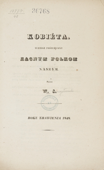 Kobiéta : wiérsz poświęcony zacnym Polkom naszym / przez W. S. - Lwów : [wydawca nieznany, 1848] (Druk. Inst. Ossol.). - [1] karta złożona (4 strony) ; 22x14 cm.