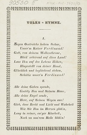 Volks-hymne. - [Miejsce nieznane : wydawca nieznany, 1848] (Bochnia : Gedruckt und zu haben bei L. Pisch). - [1] k. ; 16x11 cm.