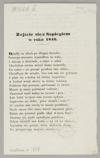 Zejście się ze szpiegiem w roku 1846. - [Lwów : wydawca nieznany, 1848]. - [1] karta złożona (4 strony) ; 20x12 cm.