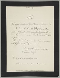 Zawiadomienie o nabożeństwie żałobnym i pogrzebie na cmentarzu Montparnasse.