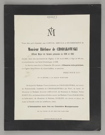 Zawiadomienie o nabożeństwie żałobnym i pogrzebie na cmentarzu Montparnasse.