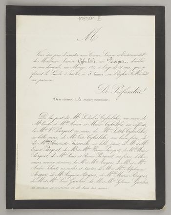 [Nekrolog. Incipit] M Vous êtes prié d'assister aux Convoi [...] Madame Jeanne Cybulski, née Pasquer [...]. - [Miejsce nieznane] : [wydawca nieznany], [około 1850] (Imp. Radiguer). - [1] karta złożona ; 27x21 cm.