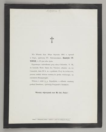 [Nekrolog. Incipit] We wtorek dnia 18-go stcznia 1881 r. spoczął [...] Benedykt Cytowicz [...]. - [Miejsce nieznane] : [wydawca nieznany], [1881] (Paryż : Drukarnia polska A. Reiffa). - [1] karta złożona ; 27x21 cm.