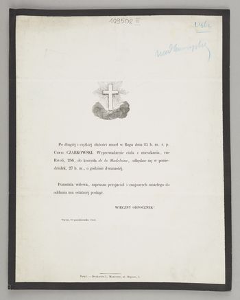[Nekrolog. Incipit] Po długiej i ciężkiej słabości zmarł [...] Cyryl Czarkowski [...]. - [Miejsce nieznane : wydawca nieznany, 1862] (Paryż : Drukarnia L. Martinet). - [1] karta złożona ; 27x21 cm.