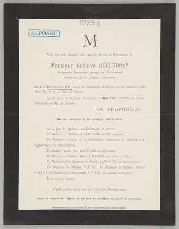 Zawiadomienie o pogrzebie na cmentarzu Montparnasse.