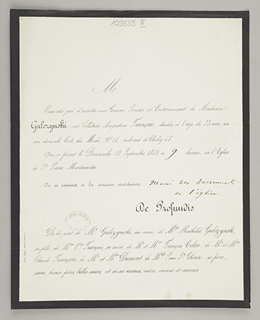 Zawiadomienie o pogrzebie na cmentarzu Montmartre.