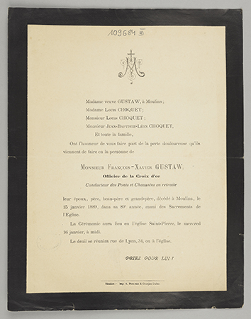 [Nekrolog. Incipit] M Madame veuve Gustaw, [...] Monsieur François-Xavier Gustaw Officier [...]. - [Miejsce nieznane : wydawca nieznany, 1889] (Moulins : Imp. A. Ducroux et Gourjon Dulac). - [1] karta złożona ; 27x21 cm.