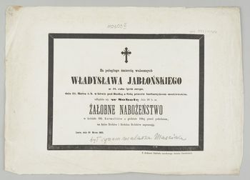 [Nekrolog. Incipit] Za poległego śmiercią walecznych Władysława Jabłońskiego, [...]. Lwów, dnia 26 Marca 1863. - [Miejsce nieznane : wydawca nieznany, 1863] (Lwów : Zakład narodowy imienia Ossolińskich). - [1] k. ; 27x38 cm.