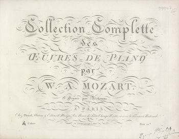 Tektura, papier zielony, na środku okładziny przedniej czerwona naklejka ze złotym, ozdobnym szlaczkiem i napisem: Oeuvres de Mozart Vol. I, na rewersie okładziny przedniej ślady po 6 lakowych pieczęciach.