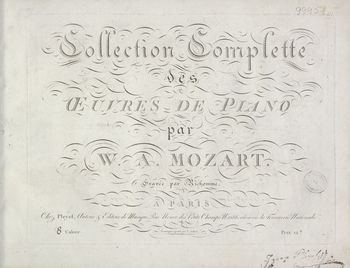 Tektura, papier zielony, czerwona naklejka ze złotym ozdobnym szlaczkiem z napisem: "Oeuvres de Mozart Vol. 3".