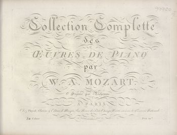 Tektura, papier zielony, na okładzinie przedniej czerwony szyldzik ze złotym szlaczkiem z tytułem: "Oeuvres de Mozart Violino".