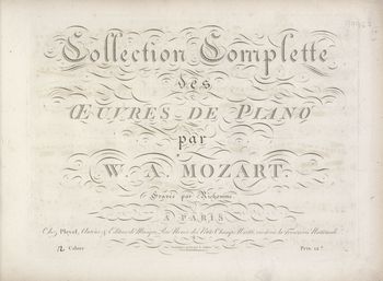 Tektura, papier zielony, czerwona naklejka ze złotym ozdobnym szlaczkiem z napisem: Oeuvres de Mozart Violoncello.