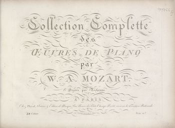 Tektura, papier zielony, czerwona naklejka ze złotym ozdobnym szlaczkiem z napisem: "Oeuvres de Mozart Violoncello".