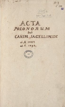 "Akta z czasów Kazimierza Jagiellończyka z lat 1447-1492". - [Około 1601-1700]. - 158 kart + + VII stron dodatkowych + 2 karty ochronne : pismo wielu rąk ; 36,5 x 25 cm.