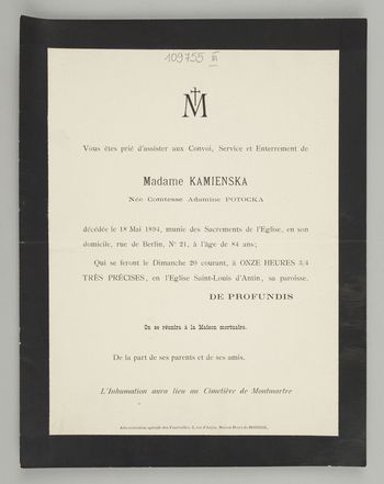 Zawiadomienie o pogrzebie na cmentarzu Montmartre