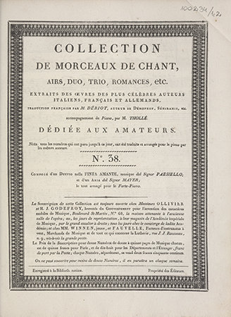 Duetto della Finta amante / del Signor Paesiello. - Paris : Ollivier et H. J. Godefroy, [około 1805]. - [1], 14 stron ; 34x26 cm.