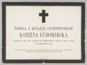 [Nekrolog. Incipit] Teresa z Książąt Czartoryskich Księżna Lubomirska urodzona 1785[...]. - [Miejsce nieznane : s.n, 1868] (Kraków : Drukarnia "Czasu" W. Kirchmayera). - [1] k. ; 30x41 cm.