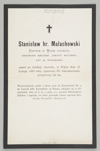 [Nekrolog. Incipit] Stanisław hr. Małachowski Kapitan B. Wojsk Polskich, [...]. - [Miejsce nieznane : wydawca nieznany, 1883] (Kraków : Drukarnia "Czasu"). - [1] karta złożona ; 22x14 cm.
