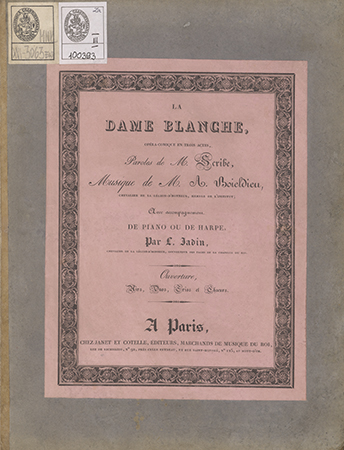 Tyt. okł.: La Dame Blanche, opéra-comique en trois actes, paroles de Scribe, musique de A. Boieldieu avec accompagnement de piano ou de harpe par L. Jadin. Ouverture, airs, duos, trios et choeurs